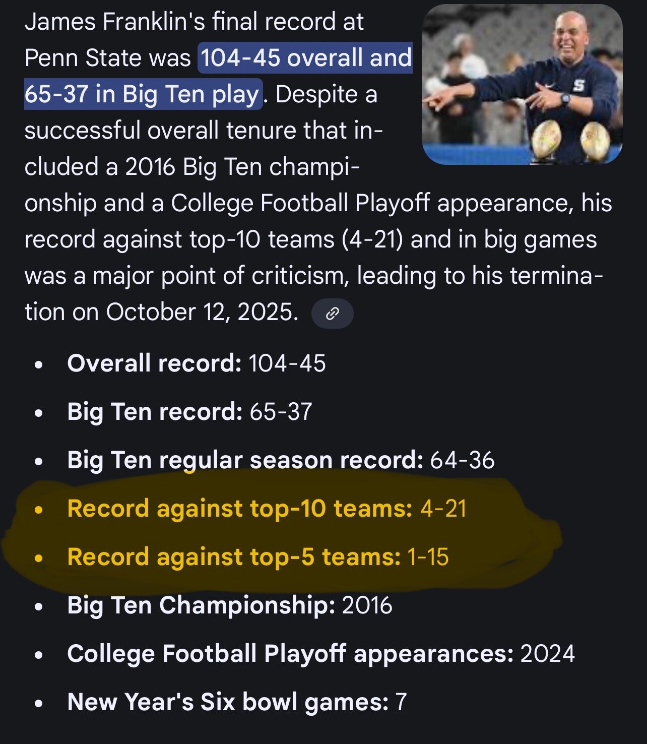 until you get to his inability to win big games. So unless there is something else that got him canned the highlighted portion is why. He knows why. But there a bunch of mid tier schools that would like to have that kind of record and the occasional chance to spoil someone’s hopes.