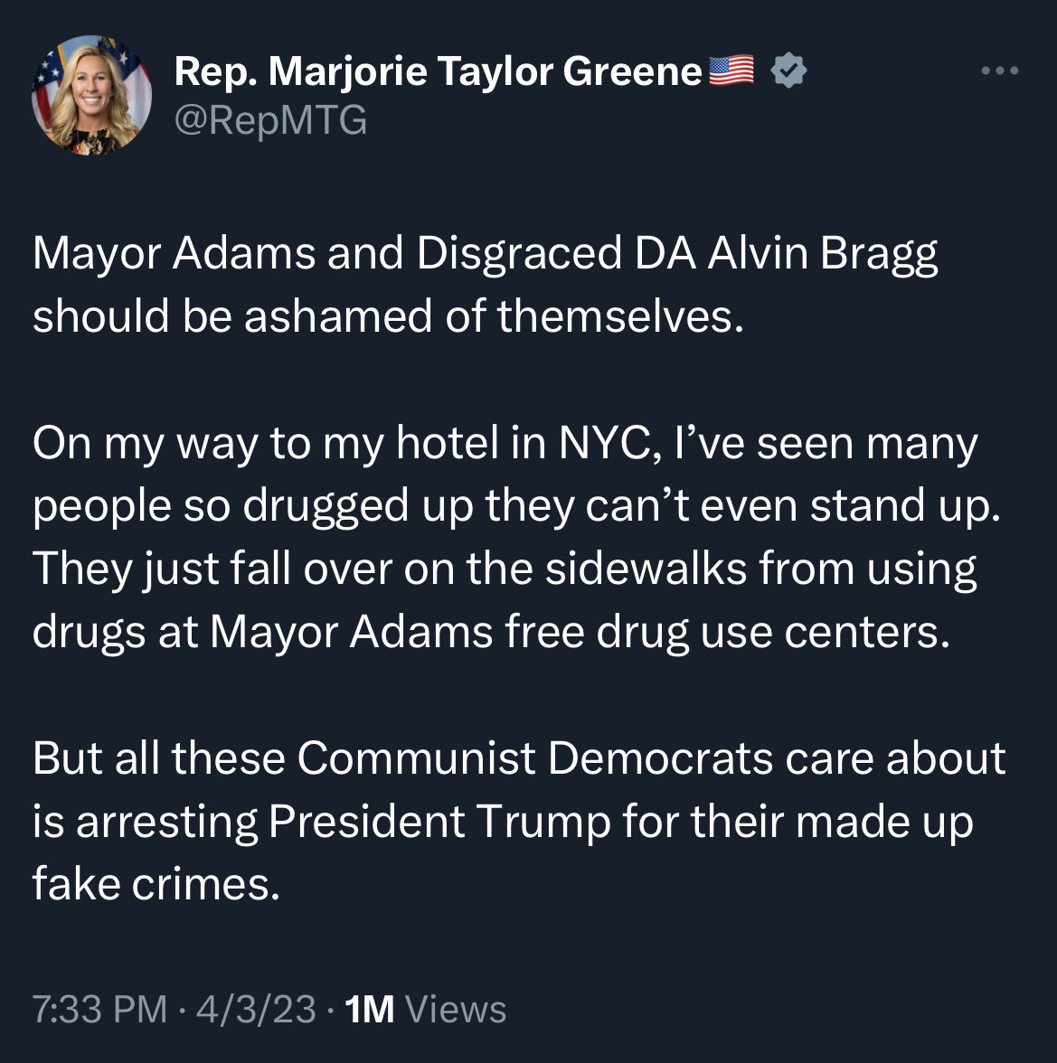 I heard Marjorie Taylor Greene was selling SIX loose cigarettes tonight in the Bowery.