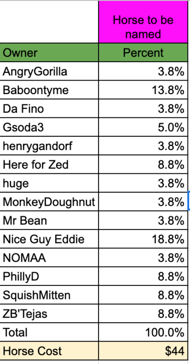 If others are interested in selling their portions of Reasonable and Red Bull, there may be some of us who would buy out what you've paid and making the pool of people involved smaller.  I'm in favor of holding these two horses for now.