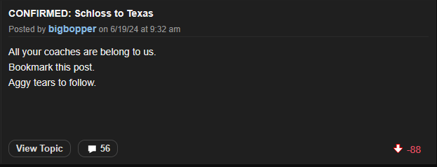 He didn't say anything just like he didn't say much about the Schloss news besides to bookmark the post 7 days in advance and aggie tears to follow.