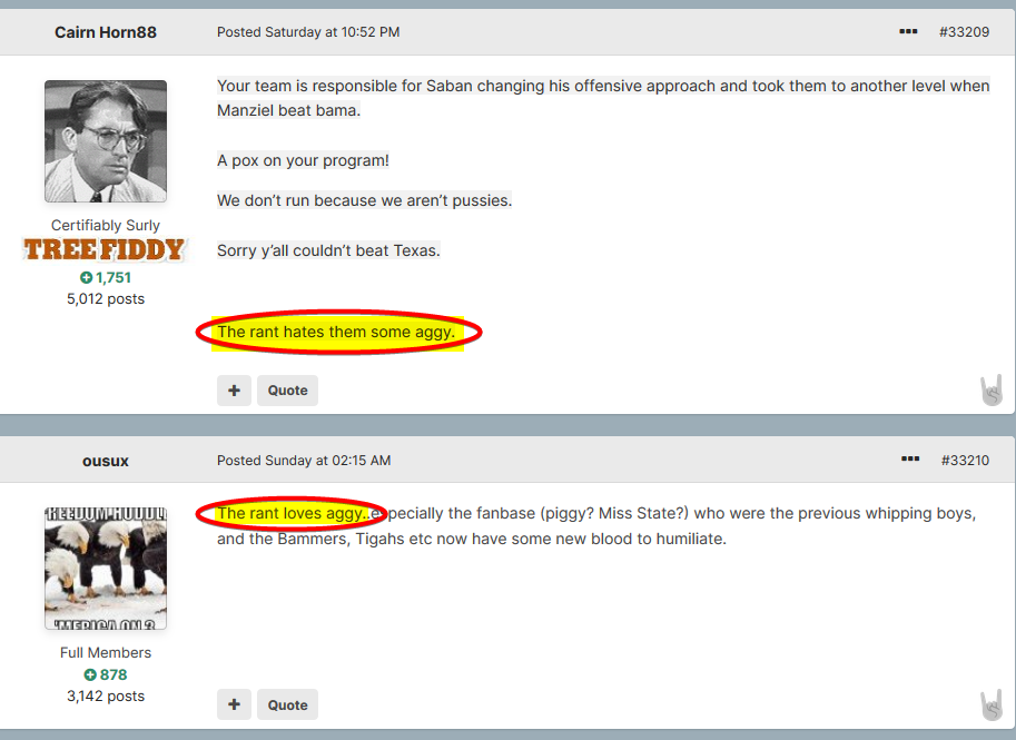The rant loves aggy..especially the fanbase (piggy? Miss State?) who were the previous whipping boys, and the Bammers, Tigahs etc now have some new blood to humiliate.