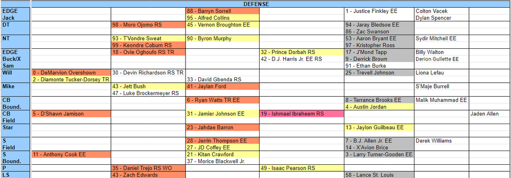 LB (12): Overshown, TBD portal, Ford, Gbenda, Richardson, Brockermeyer, Abiara, Harris, Blackwell, Johnson, Kerry, TBD recruit