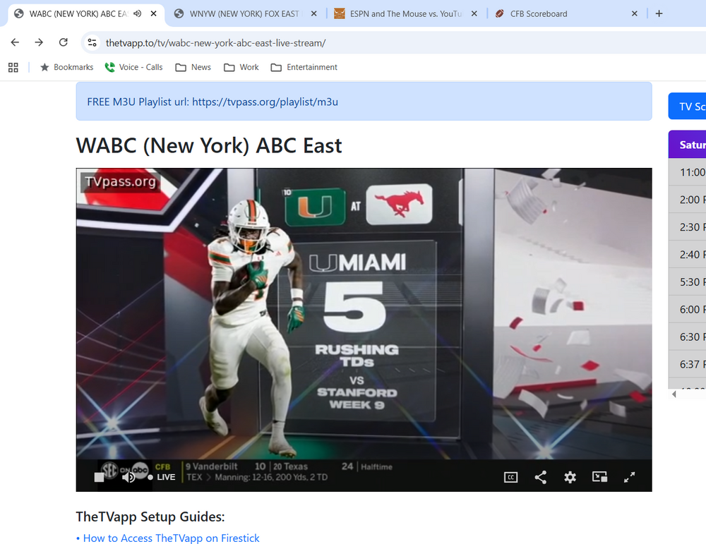 So I still had the ESPN app working, and for some reason, I flipped over to the YTTV app, and when I do "list," none of the ESPN channels show, but on the "recommended shows" it had the Myrtle Beach Bowl, and I clicked it, and boom, football game on ESPN was showing on my TV.