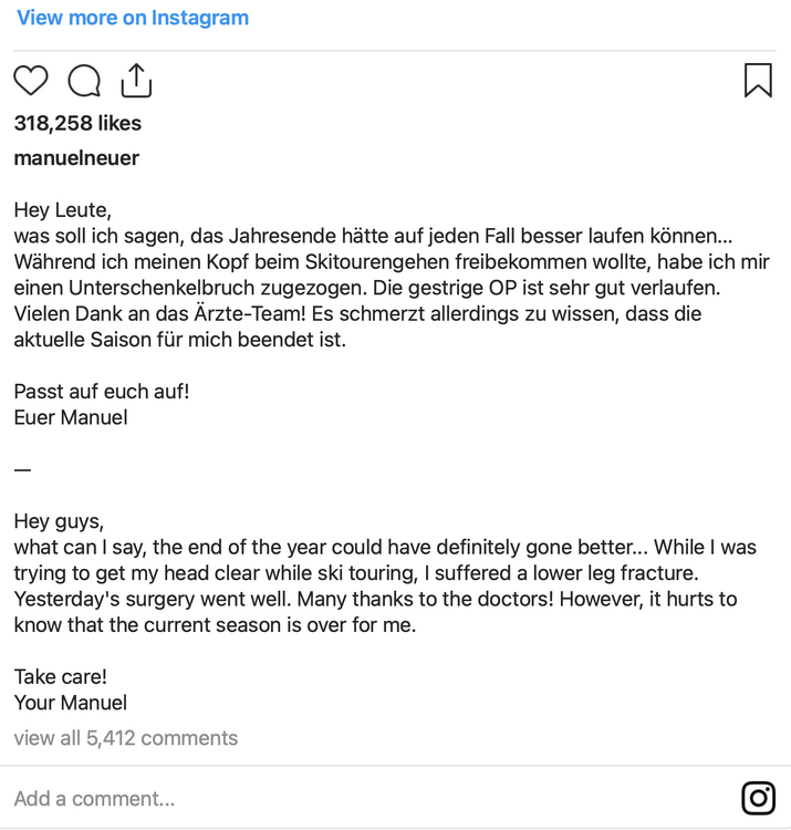 "Manuel Neuer has been ruled out for the rest of the season after our captain fractured his right leg during a skiing accident. He has already undergone a successful operation," Bayern Munich said in a statement.