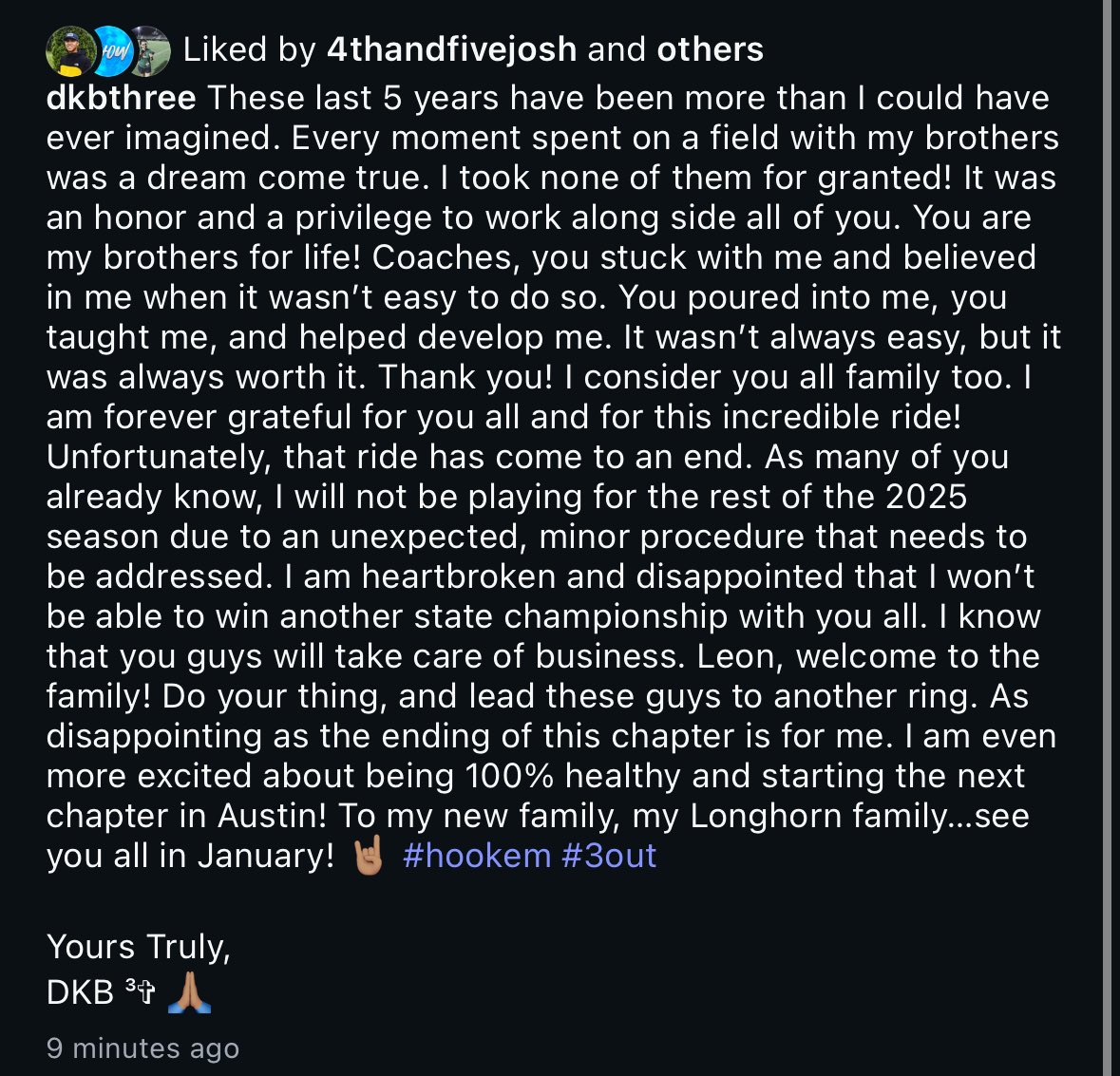 Auburn has told the family that they would take Chris Wells. That's what makes this recruitment sticky. On the Texas side, Chris Wells has a spot at Texas - should he want to be in Austin. It would be the same as Jordan Coleman, Devin Coleman and Isaiah Coleman in the 2025 cycle. It was good for Chris Wells to see Isaiah Coleman on the field late in the game Saturday night to know what's possible.