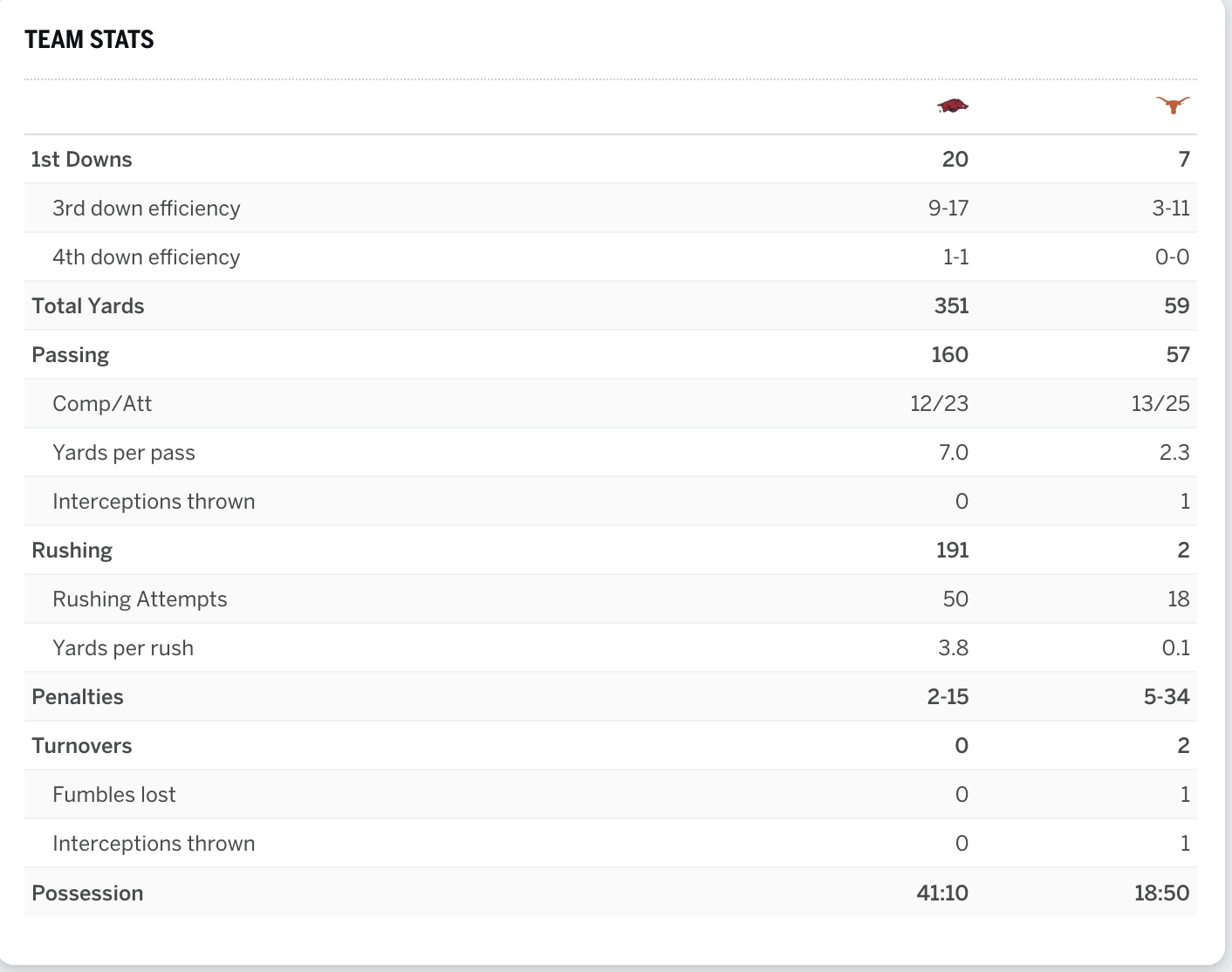 On Dec 30, 2014, the Texas offense produced 59 yards of total offense against Arkansas.  57 passing and 2 rushing in a 31-7 beatdown.  44 of those yards game on the TD drive.