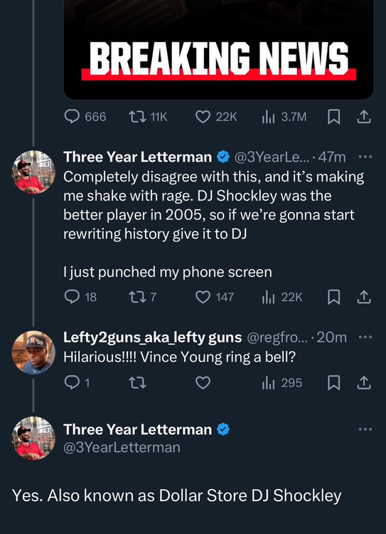 Texas's only close game was at Ohio State, which featured basically an NFL defense and a shitload of talent all over the roster and finished #4 in the country. I guess people didn't realize that Mack took his foot off the pedal in almost every game and VY hardly played 4th quarters that year. It was things like the winning drive in Columbus; the ass-kicking of OU after losing 5 straight; facing a Kansas team in November that had the top rush defense in the NCAA...and running for over 300 yards and leading 52-0 at halftime; winning the conference championship game 70-3...and basically running the clock for the last 25 minutes of the game - all those things convinced me that the team was different.