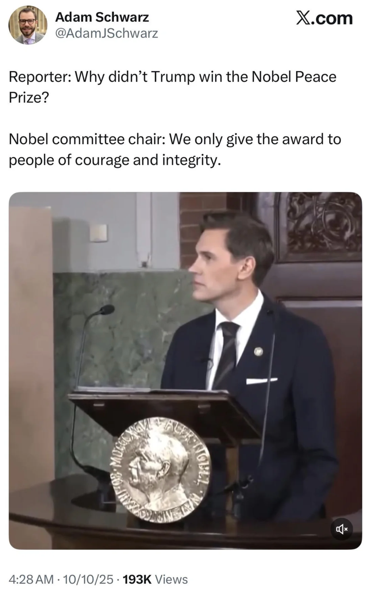 And by the time the Nobel committee meets again for the 2026 Peace Prize, there likely won't be any sustained peace in the region, Putin will still be fucking with Ukraine, Trump's federalized national guard will have bullied and agitated a dozen other cities, and we will have killed every last Greenlander.