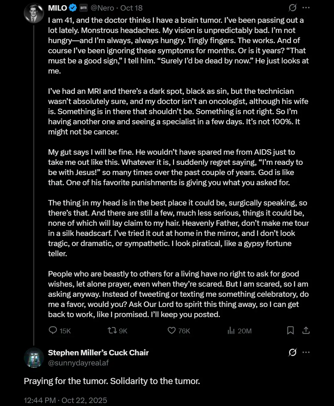 One “dark spot”?  Depends on which sequence he is talking about but “dark, black as sin”  on all sequences indicates heavily calcified and probably benign like meningioma.  Milo, being a shitty human, is probably gonna live a long long life.