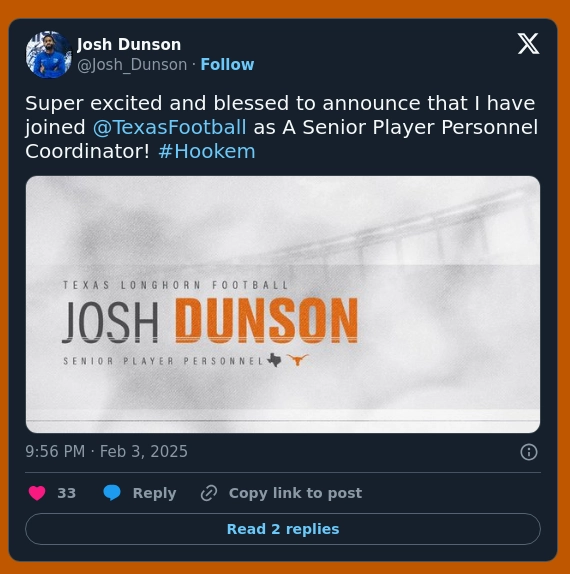 Damn nice additions.  Like the Dunson (BB should check that spelling) hire for recruiting with ties to TX, LA, GA. Let him focus on those LA, GA guys!