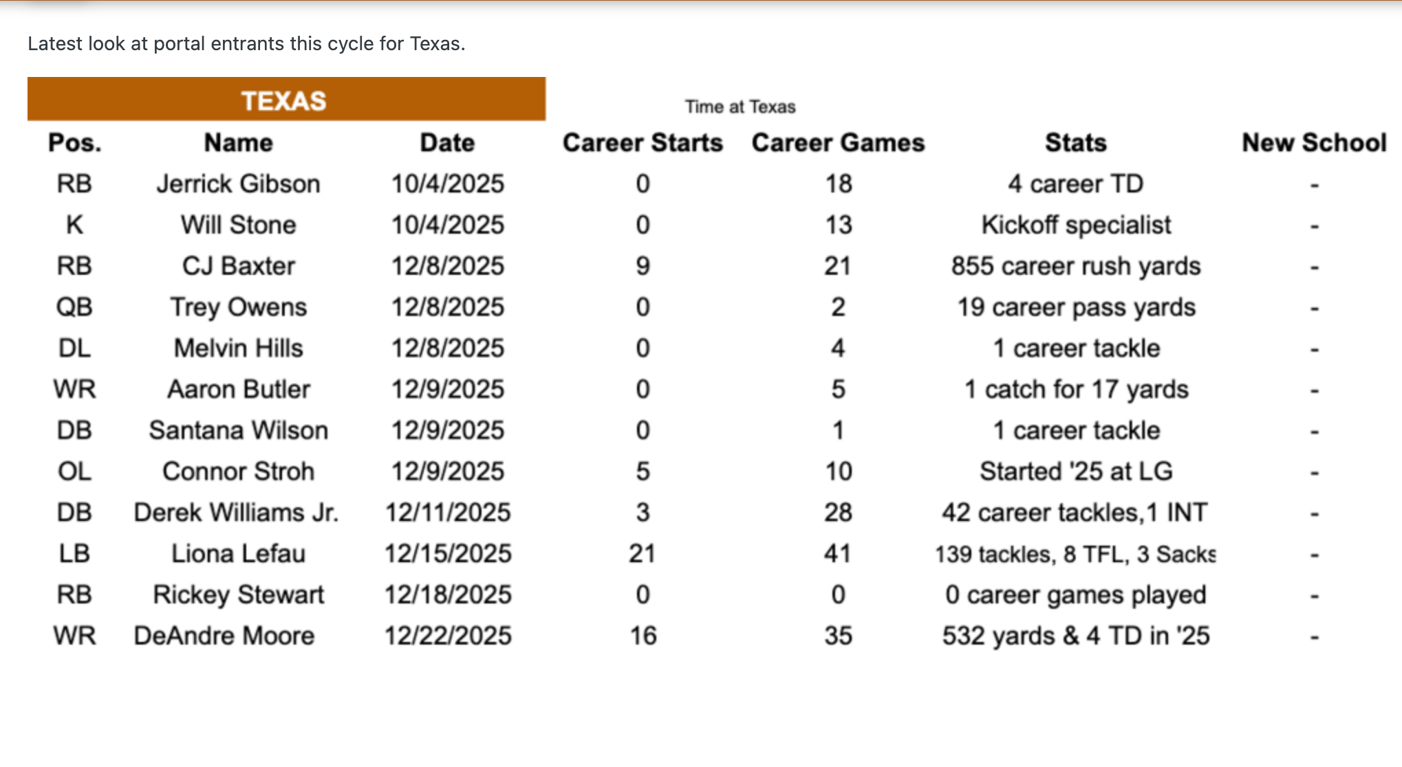 Already, five players who have entered the portal from Texas' 2025 roster have started a game in their career. In fact, there were a combined 54 starts among those five players.