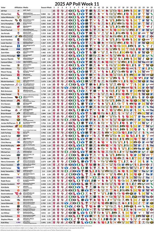 Interesting stuff and goes back to my point that one place of difference between teams at the 10 or below spot is mostly just noise. I don’t have the energy to count but Texas may lead OU on more ballots than not. A quick scan says that the Kentucky and LSU voters have Texas farthest behind OU. The A&M voter has Texas at 11 and ahead of OU.