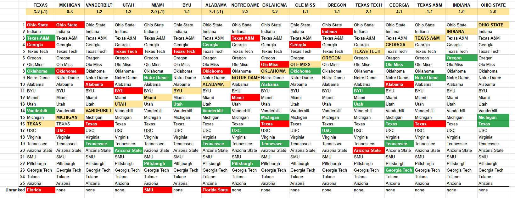 Here's a table showing last week's CFP poll, ranging from Texas at #16 to Ohio State at #1, and the records of each team against the rest of the Top 25 field, along with any unranked losses.