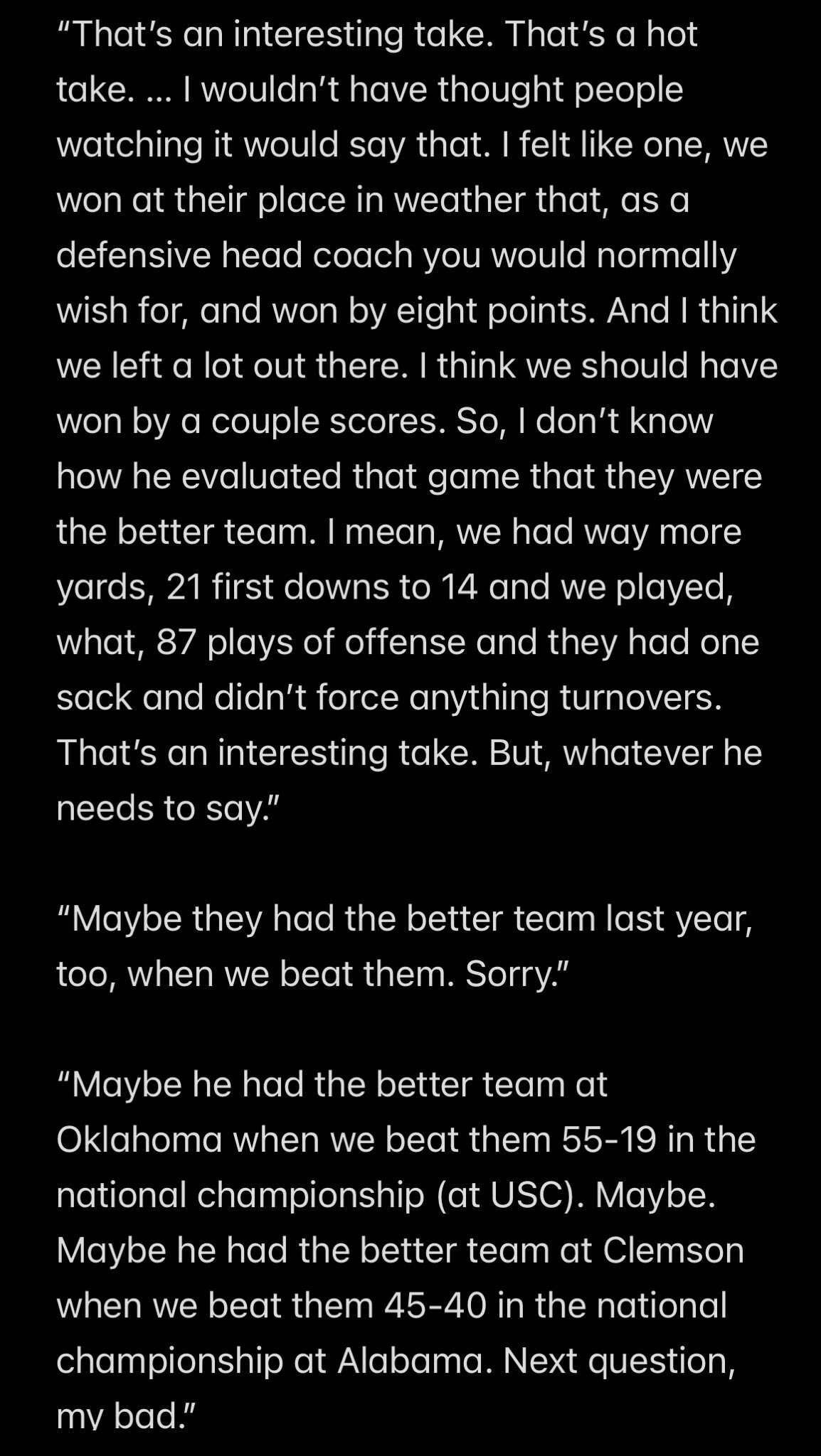 This was pretty good, responding to Venables saying that OU had the better team on Saturday