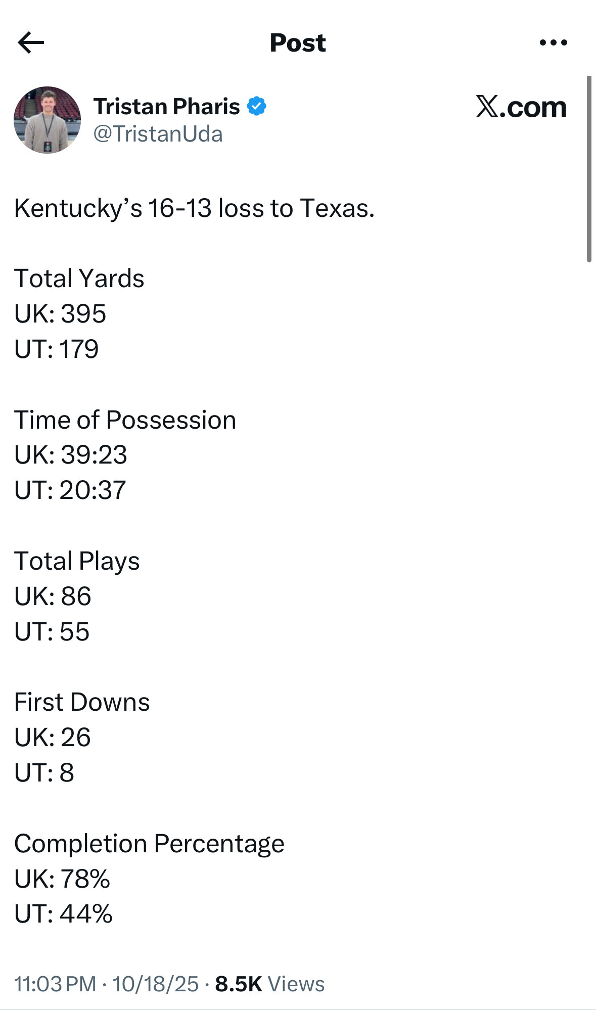 that said, im not sure kentucky is quite as bad as people want to make them out to be.  last year they nearly beat georgia, vandy and tennessee, beat ole miss on the road, and even gave texas a bit of a challenge in austin.  earlier this year they gave ole miss a pretty big scare again.  they arent a great football team, but i dont think they are complete garbage as some are saying.  and texas is a young team still growing, with an inexperienced QB getting some solid tests in hostile road environments.  im curious to see if they grow from this, or crumble.