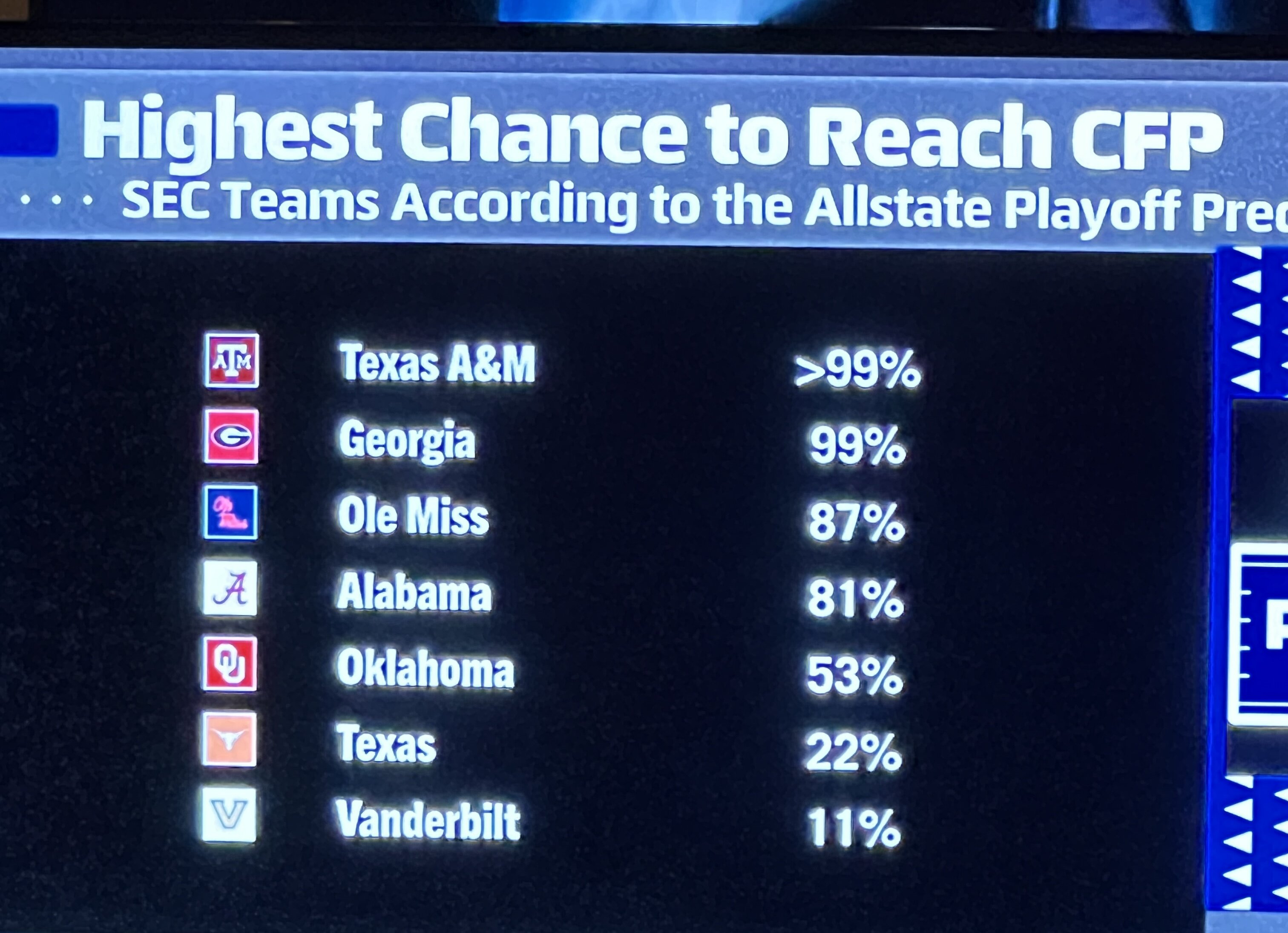 Were cooked. Even with a win over piggy & aggy, We need blOU to lose to Midzoo or LSU (probably not happening). We need tortilla tech to beat BYU again. We need Vandy to lose another game. And we need the committee to put us in with 4 other sec teams.
