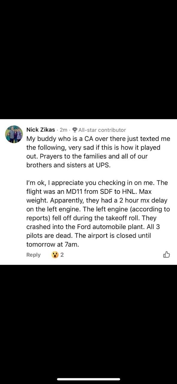 Mentioned before my sis-in-law is a Captain for UPS. She was at the facility and just finished annual simulator training when it happened. They could see the fireball from their window. There may have been 4 jump seaters along with the crew.