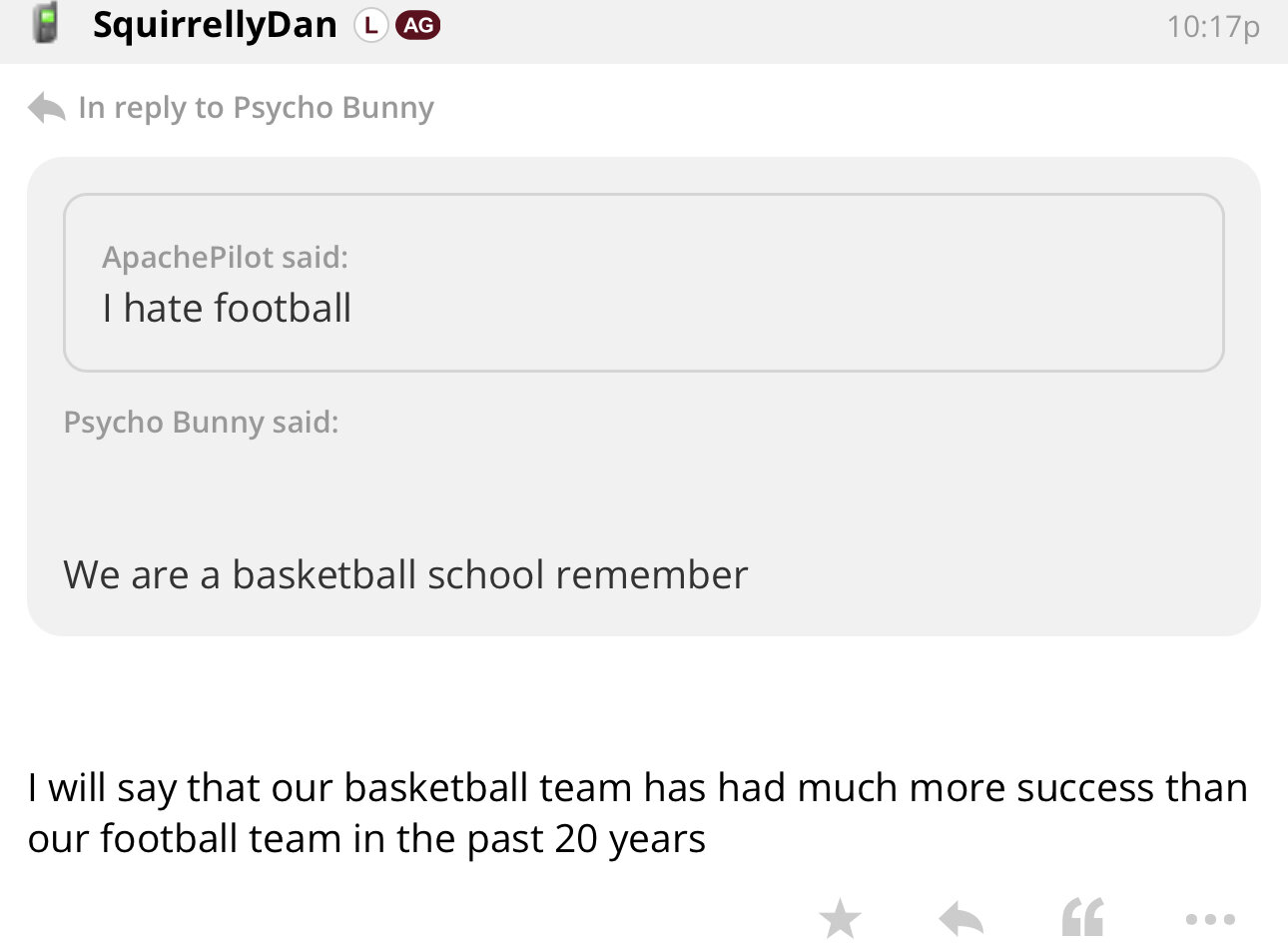 I'll be honest - I wouldn't want to play Indiana right now. I don't think we win that game. Aggy was always fool's gold, and the RRS is a different animal. Vandy is good, but not CFP good. It is what it is.