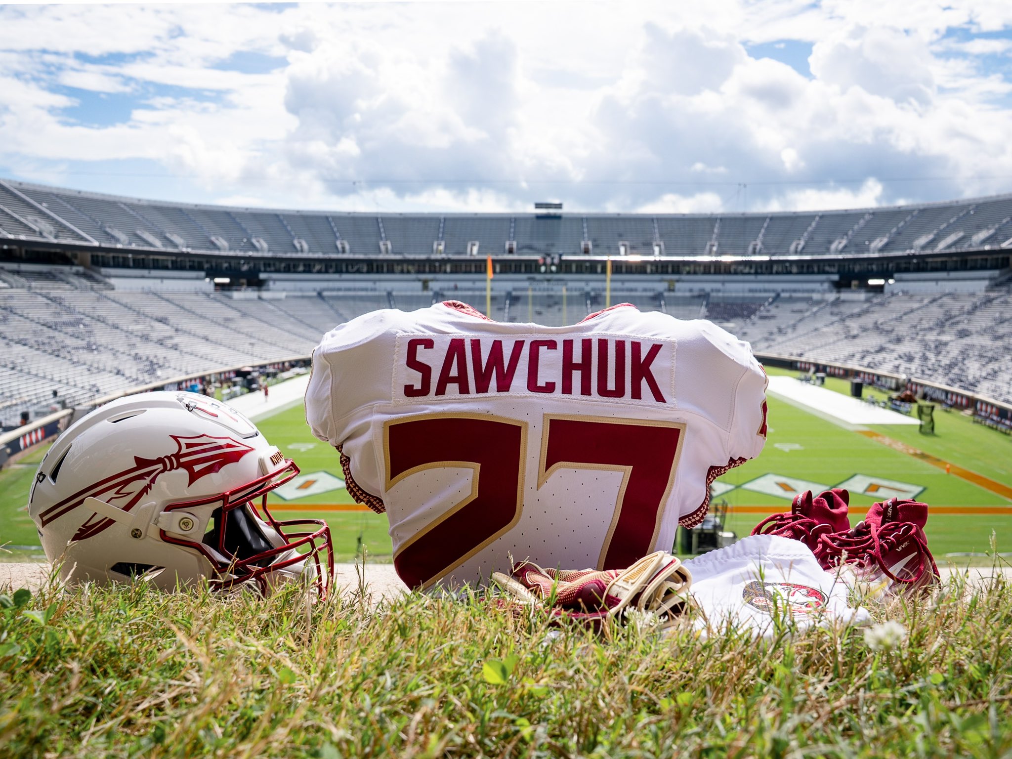 The super huge spiky numbers, helmet with lots of garnet and black stickers, and garnet and gold collar and accessories all kind of muddy it up in practice. Not a natural look for FSU.